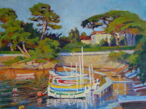 The combination of picturesque subject matter and beautiful golden light made this scene exceptionally exciting to me. I wish I'd have been equipped to do it larger. I loved the shapes and dimensionality and negative spaces of the umbrella pines that grow on Cap d'Antibes (in the background) and was taken with the brightly painted sailboats. (Collection Betsy Steele and Lee Knoch).